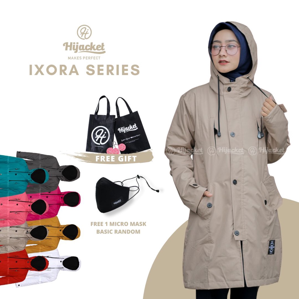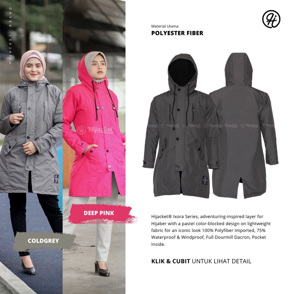 Hijacket Ixora Original adalah seri jaket hijaber dengan desain & model yang unik & iconic, terinspirasi dari jaket khusus petualang, model ini di buat khusus untuk wanita muslimah yang suka berpetualang ataupun aktivitas di luar ruangan. Warna-warna pastel yaitu Bondi Green, Candy Pink, Cold Grey, Putih Salju, merah crimson, Deep Pink dan Golden Rood.