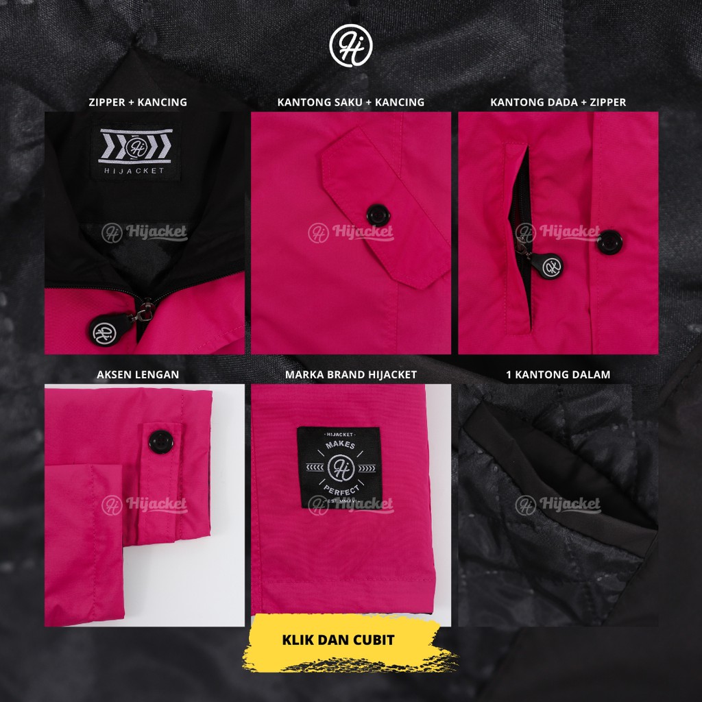 Berbahan parasut premium, Hijacket Ixora berbahan 100% kain polyfiber impor, 75% waterproof and windproof, bagian dalam menggunakan bahan full Dourmill Dacron yang lembut dan terdapat kantung saku pada bagian dalam.