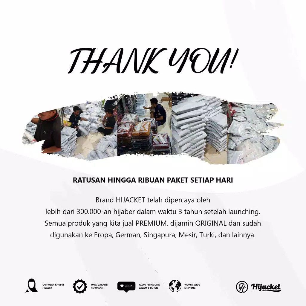 Jaket Muslimah Hijaber Hijacket telah dipercaya oleh lebih dari 300.000-an hijaber dalam waktu 3 tahun setelah launching. Semua produk yang kita jual PREMIUM, dijamin ORIGINAL dan sudah digunakan ke Eropa, German, Singapura, Mesir, Turki, dan lainnya.