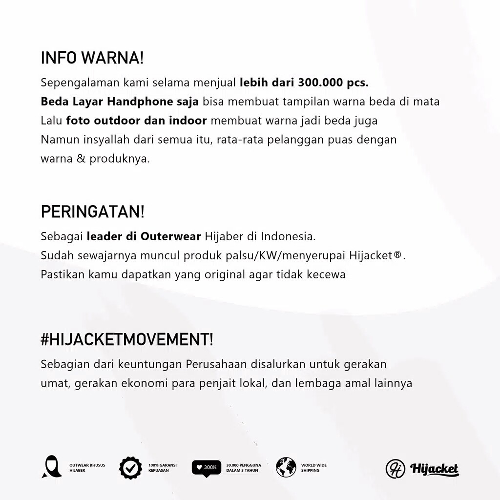 - Produk ini tidak sedang Flash Sale, tidak semua Seller suka Flash Sale, saya rasa ini bukan kekurangan, Jika Anda anggap Harga Rp. 249.000,00 itu murah untuk JAKET WANITA MUSLIMAH HIJACKET® BELVA COULDGREY ORIGINAL JAKET HIJAB NO.1 DI INDONESIA ya ambil saja